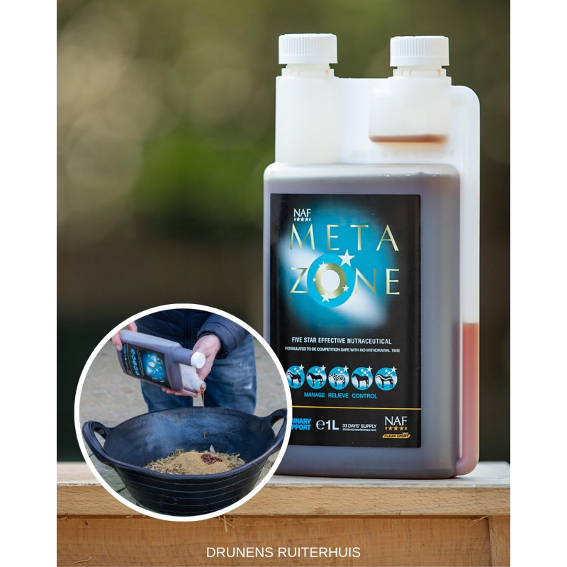 METAZONE NAF Five Star Metazone is een nieuw voedingssupplement ontwikkeld voor de ondersteuning van paarden die net dat beetje extra kunnen gebruiken. Metazone is samengesteld uit een synergetische mix van ingrediënten die het natuurlijk herstel van het paard ondersteunen. De plantaardige fytochemicaliën waaruit dit product bestaat ondersteunen het natuurlijke herstelproces in het hele lichaam, of het nu gaat om gewrichten, hoeven, pezen, ligamenten, spieren of de huid. Gebruiken tijdens wedstrijden zonder wachttijd, wat inhoudt dat het dagelijks gevoerd kan worden om je paard ‘in the zone’ te houden.