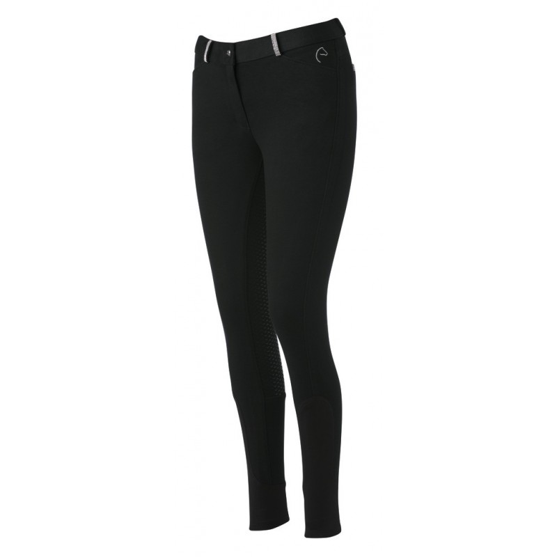 Comfortabele rijbroek met een zeer chique uitstraling doordat de riemlussen op de tailleband en de valse zakken aan de achterkant zijn versierd met strass net als de knoopsluiting. Van rekbare katoen, recht model met steekzakken aan de voorkant. ¾ anti-slip zitvlak met siliconen inzets voor een betere beenligging en goede grip in het zadel, tailleband met lussen en onderbeen met elastaan. Samenstelling: 95% katoen, 5% elastaan. Machinewasbaar op 30°C.
