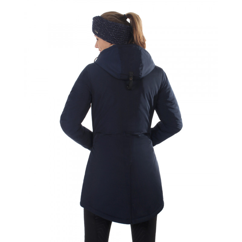Met deze lange gewatteerde jas trotseer jij de koude winterdagen met gemak. De achterkant bevat een rits zodat deze open te ritsen is wanneer je op het paard stapt. De jas sluit altijd mooi aan door het trekkoord bij de taille, heeft elastische mouwafsluiting en de capuchon kan worden vastgezet tijdens het rijden.